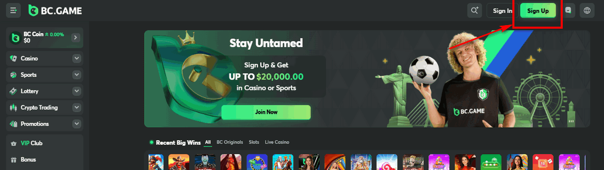 - Navigate to BC.Game. Access the BC.Game website by clicking on “Play Now” or using the site’s header, often represented by three horizontal lines or dots.